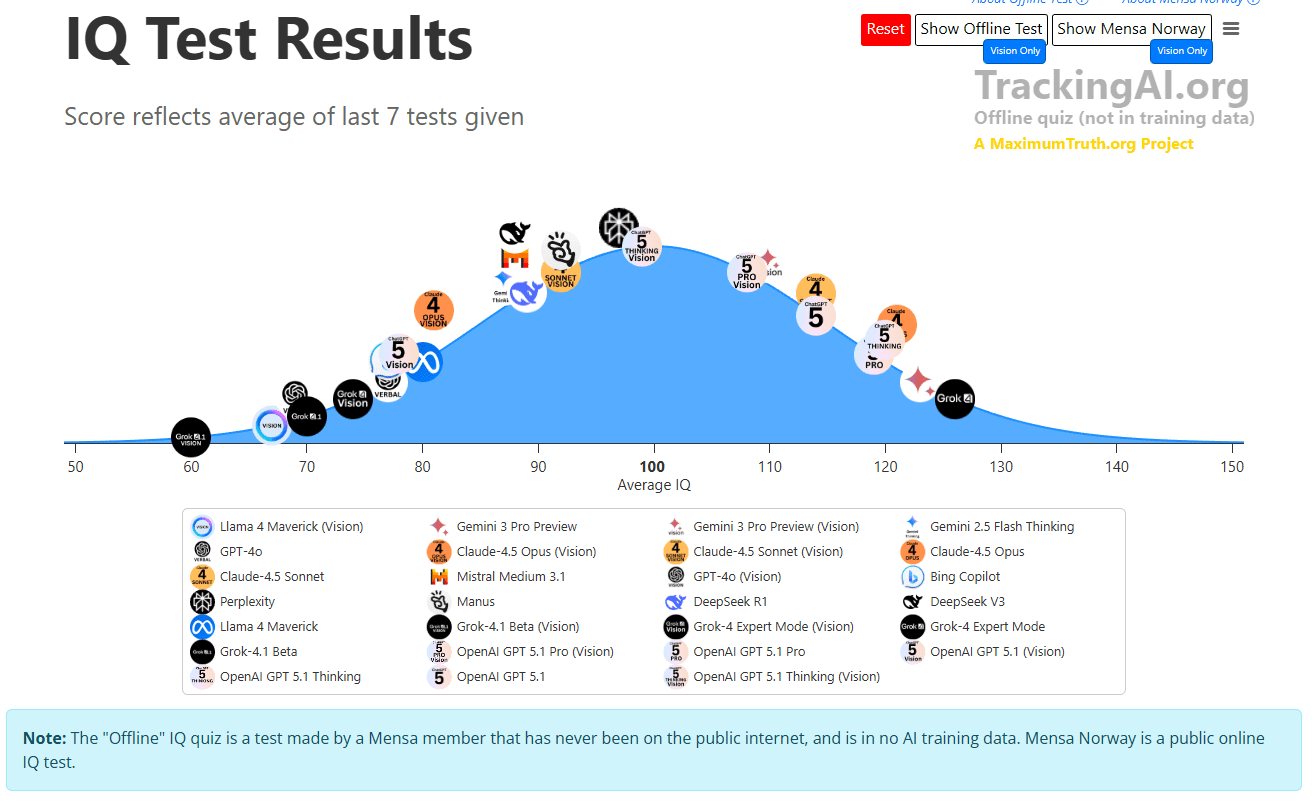 Now here's the data that should make you pause. TrackingAI.org, run by Maxim Lott of the Maximum Truth project, has been testing these models on Mensa-calibre IQ tests. The results as of November 27, 2025: GPT-5.1 Pro scores 144 IQ. Gemini 3 Pro Preview hits 142. GPT-5.1 Thinking reaches 138. Grok-4 Expert Mode lands at 136. Claude-4.5 Opus comes in at 124. To put this in context, Mensa membership requires 130 or above. We now have multiple AI models scoring well into Mensa territory, with the top performers approaching the genius threshold of 145+. Six months ago, the frontier models were clustering around 100-110.